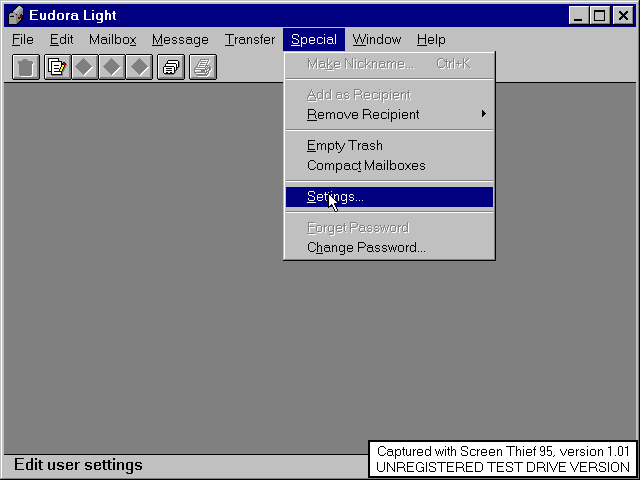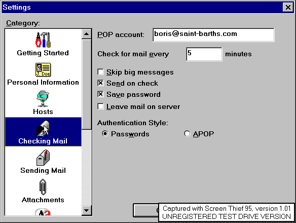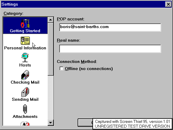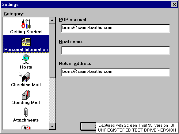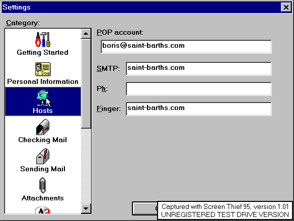 In this example set up, we'll show how to set up the Eudora configuration for a user with user id boris and full name Boris Bladenov.