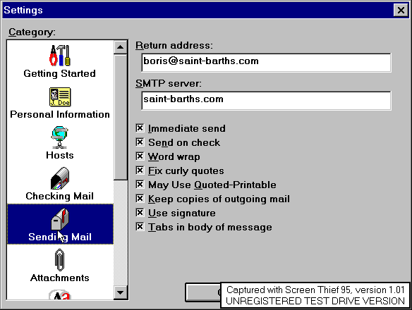 All of the check boxes on this configuration panel should be checked. If you want to compose out going e-mail off-line and then connect and send it all at once you would remove the check mark from Immediate send and do a manual send on you connected to your SLIP or PPP account.